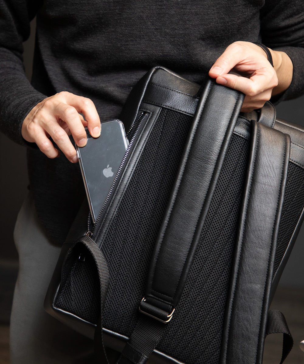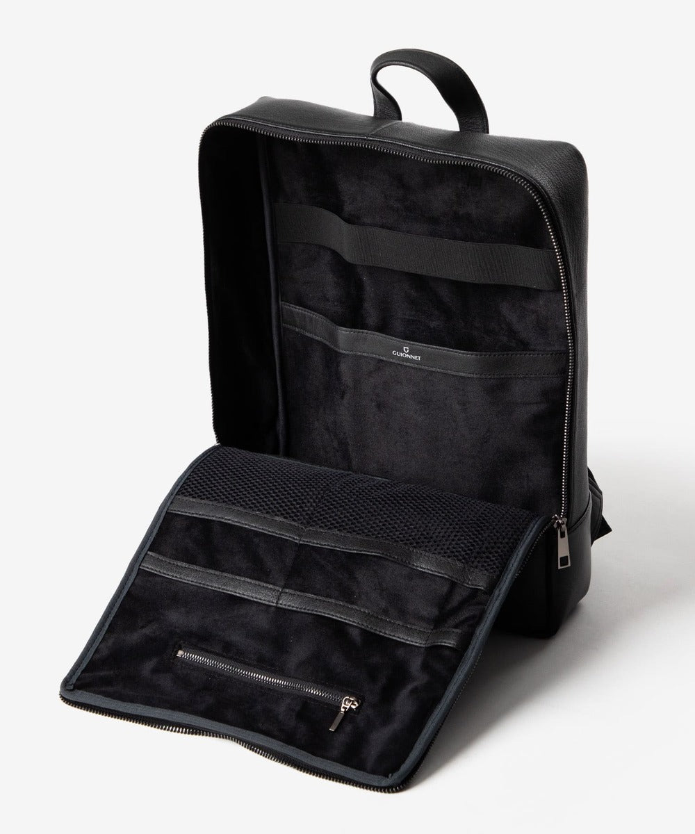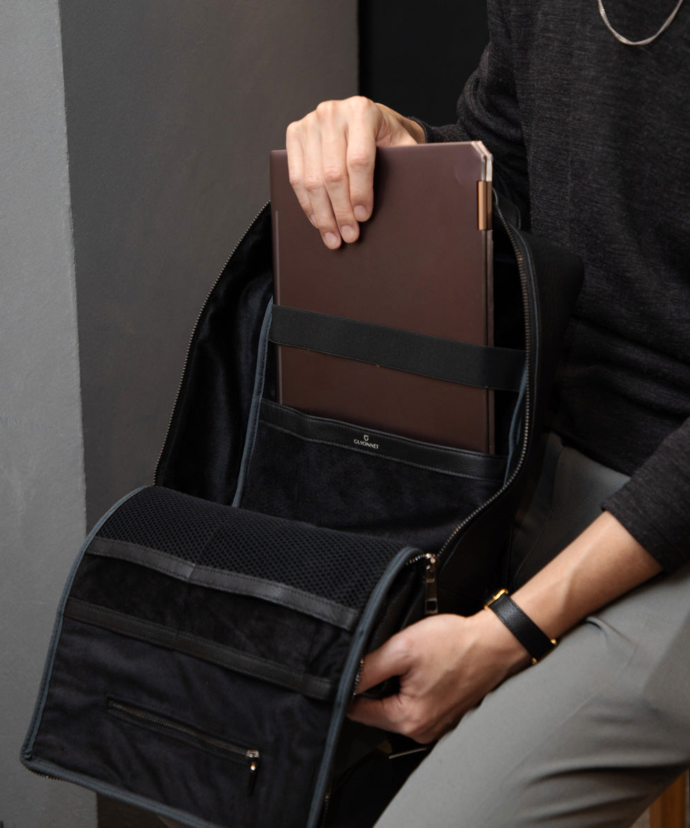 ファスナーには、クロムブラックを採用することで端正な顔立ちに。ライニングは肌触りの良いマイクロスエード調素材を採用。インナーは使い勝手を考えたポケット配置と14インチノートPCを収納できるスリーブ付。
