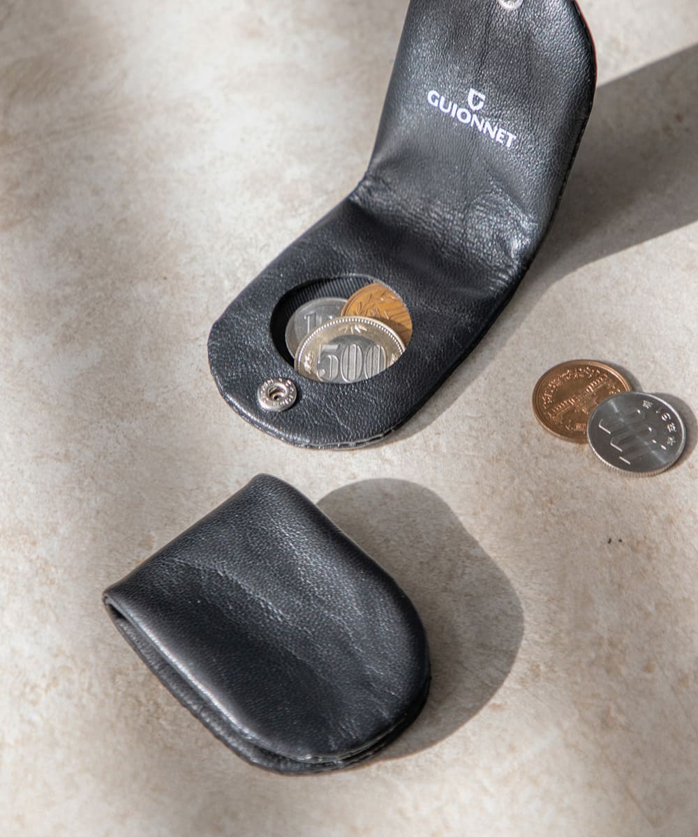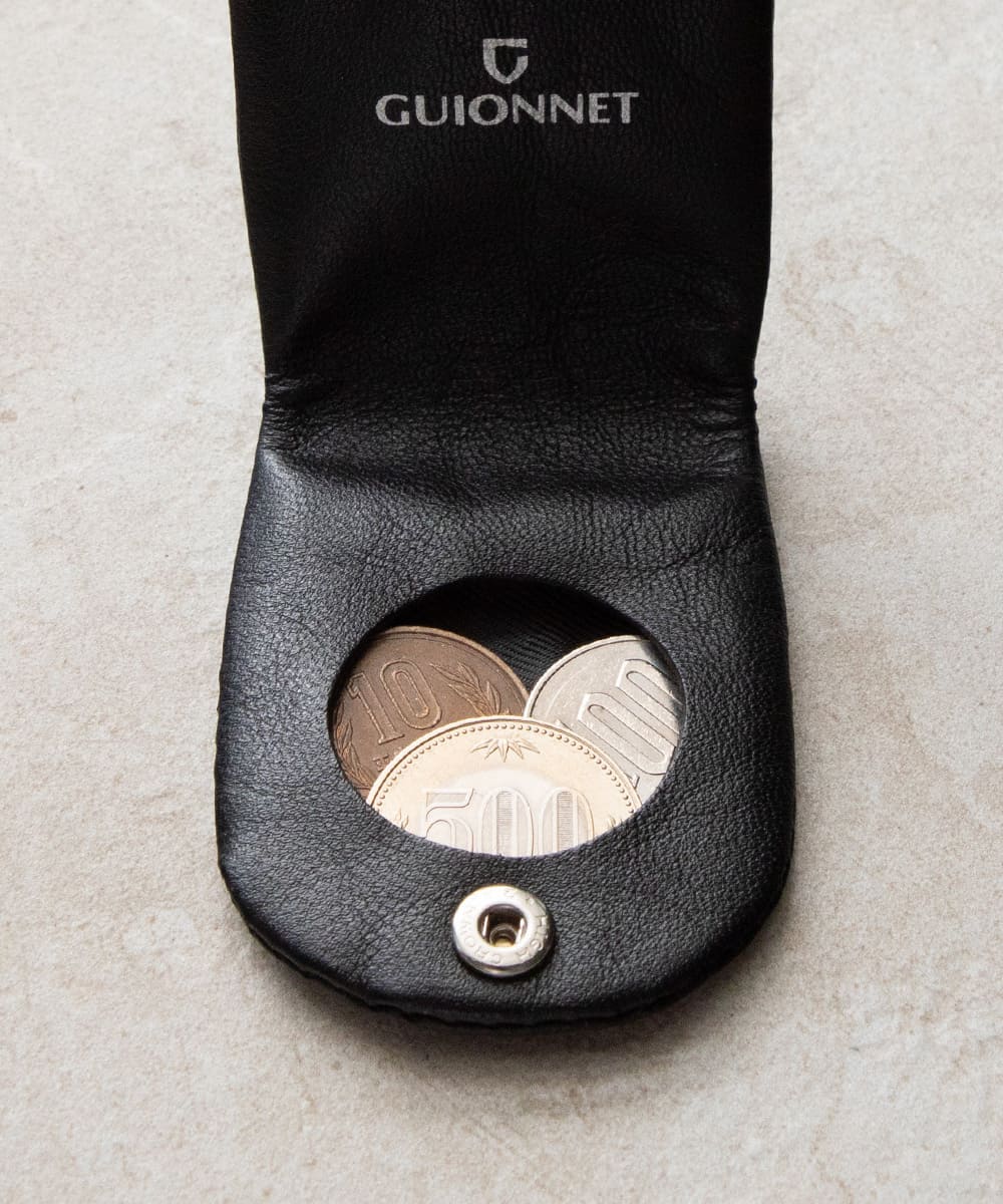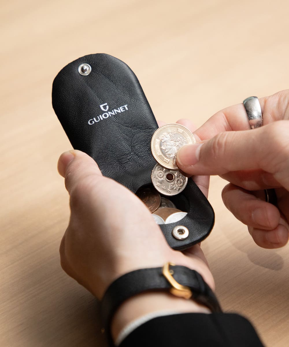 スナップボタンを開けて円形の孔から小銭を出し入れします。
