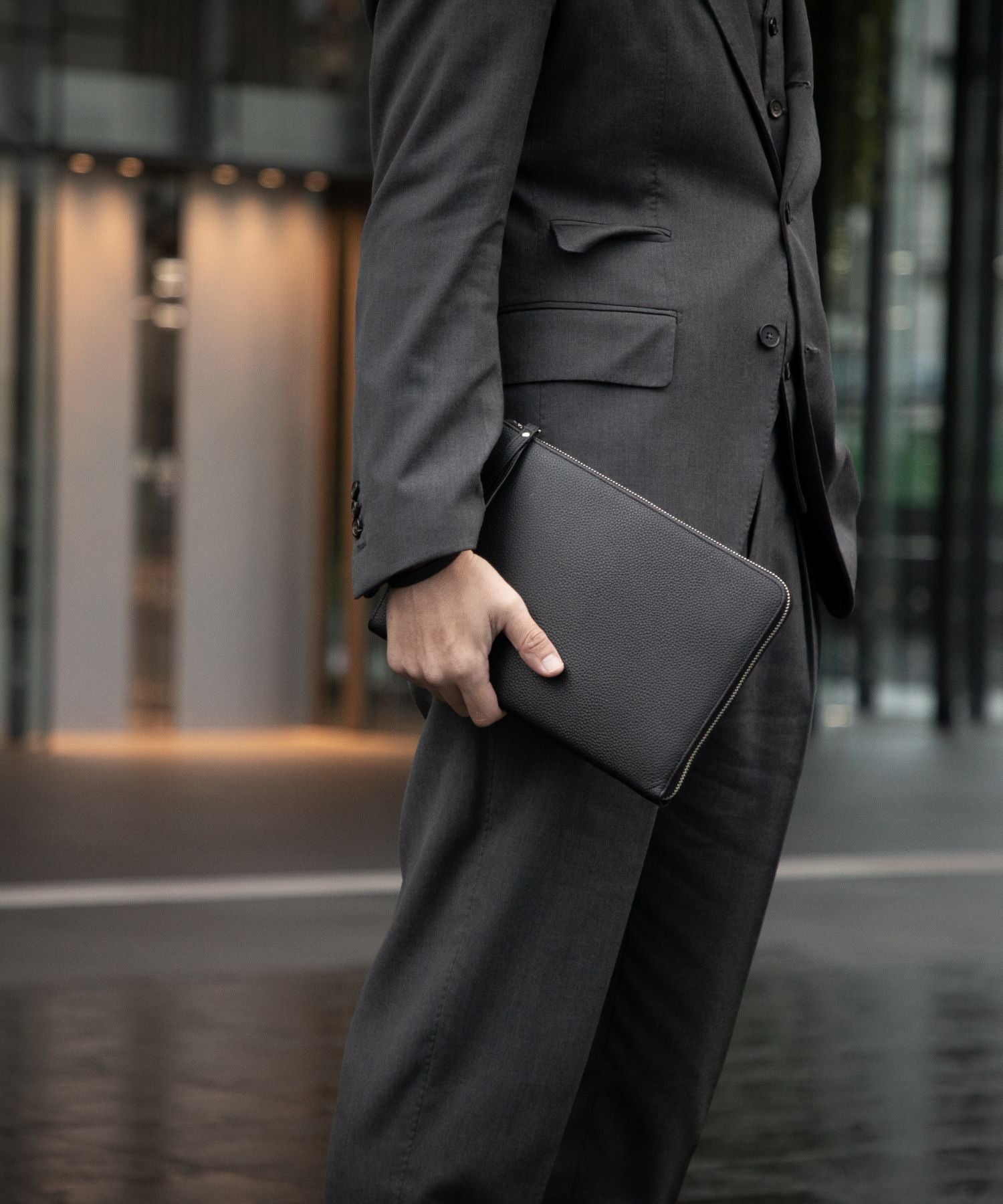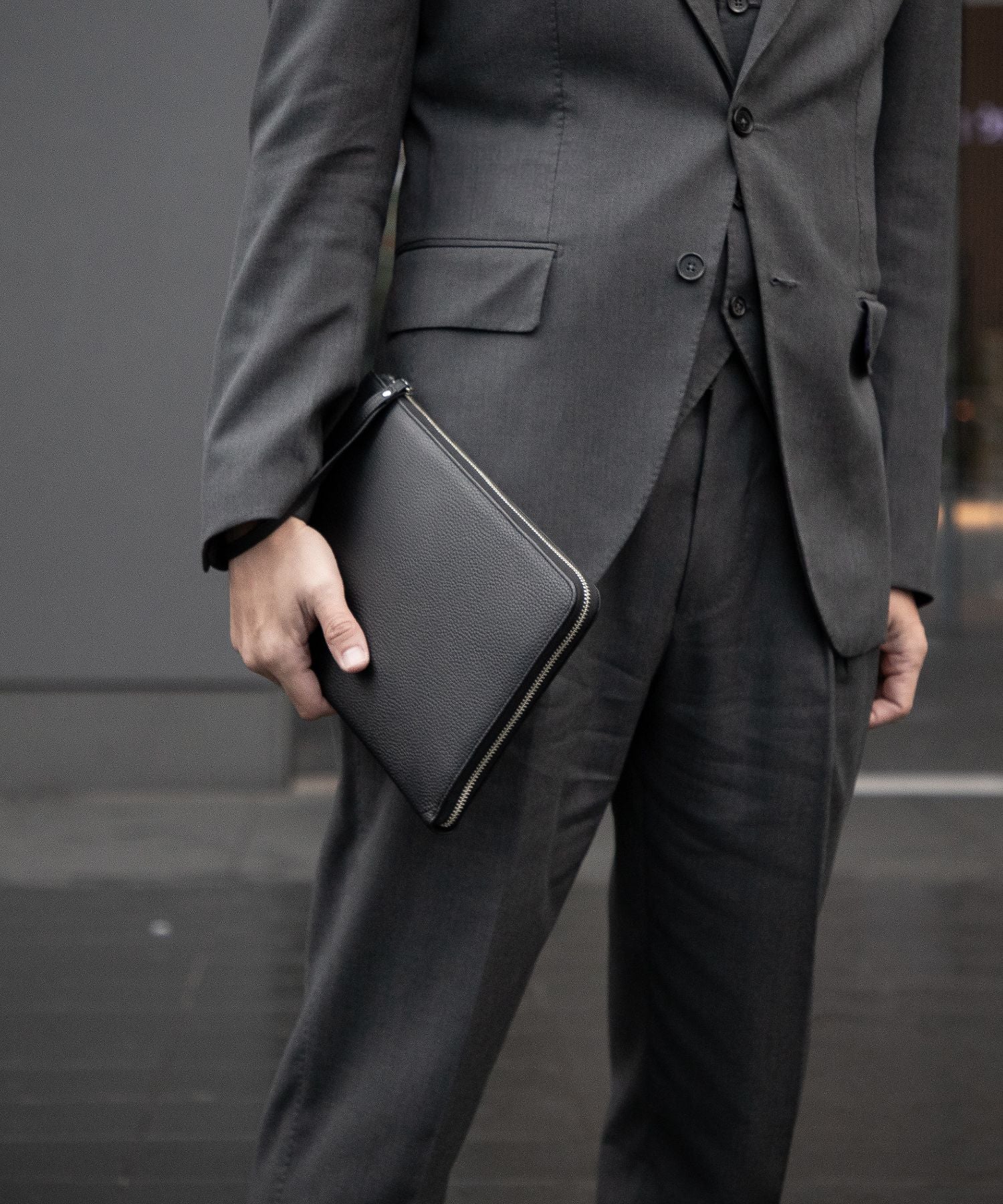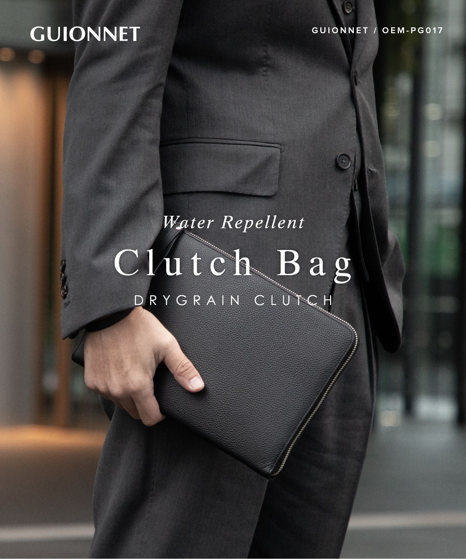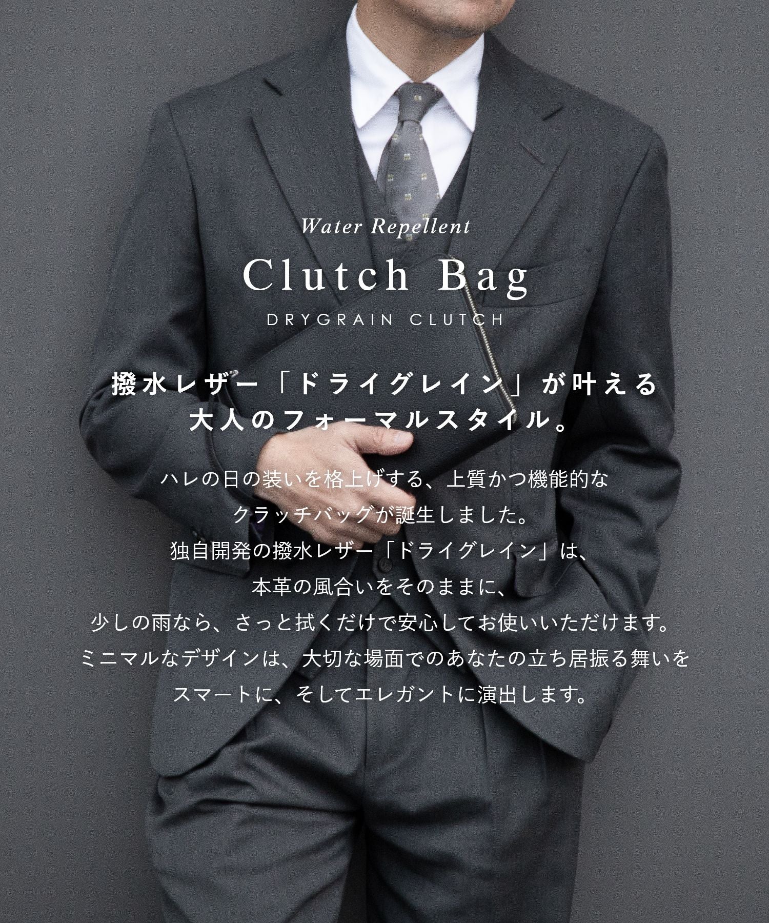 ハレの日の装いを格上げする、上質かつ機能的なクラッチバッグが誕生しました。ミニマルなデザインと、独自開発の撥水レザー「ドライグレイン」が、大切な場面でのあなたの立ち居振る舞いを、スマートに、そしてエレガントに演出します。