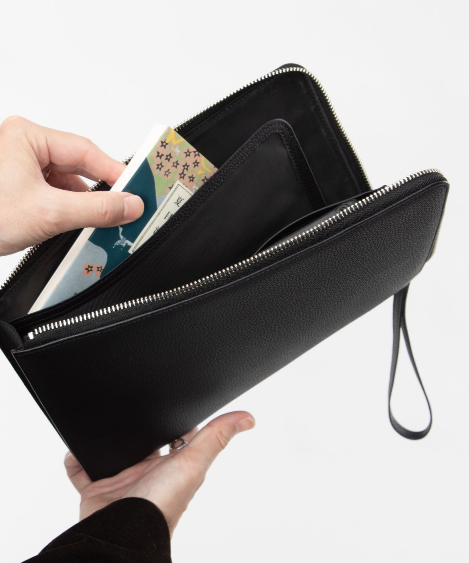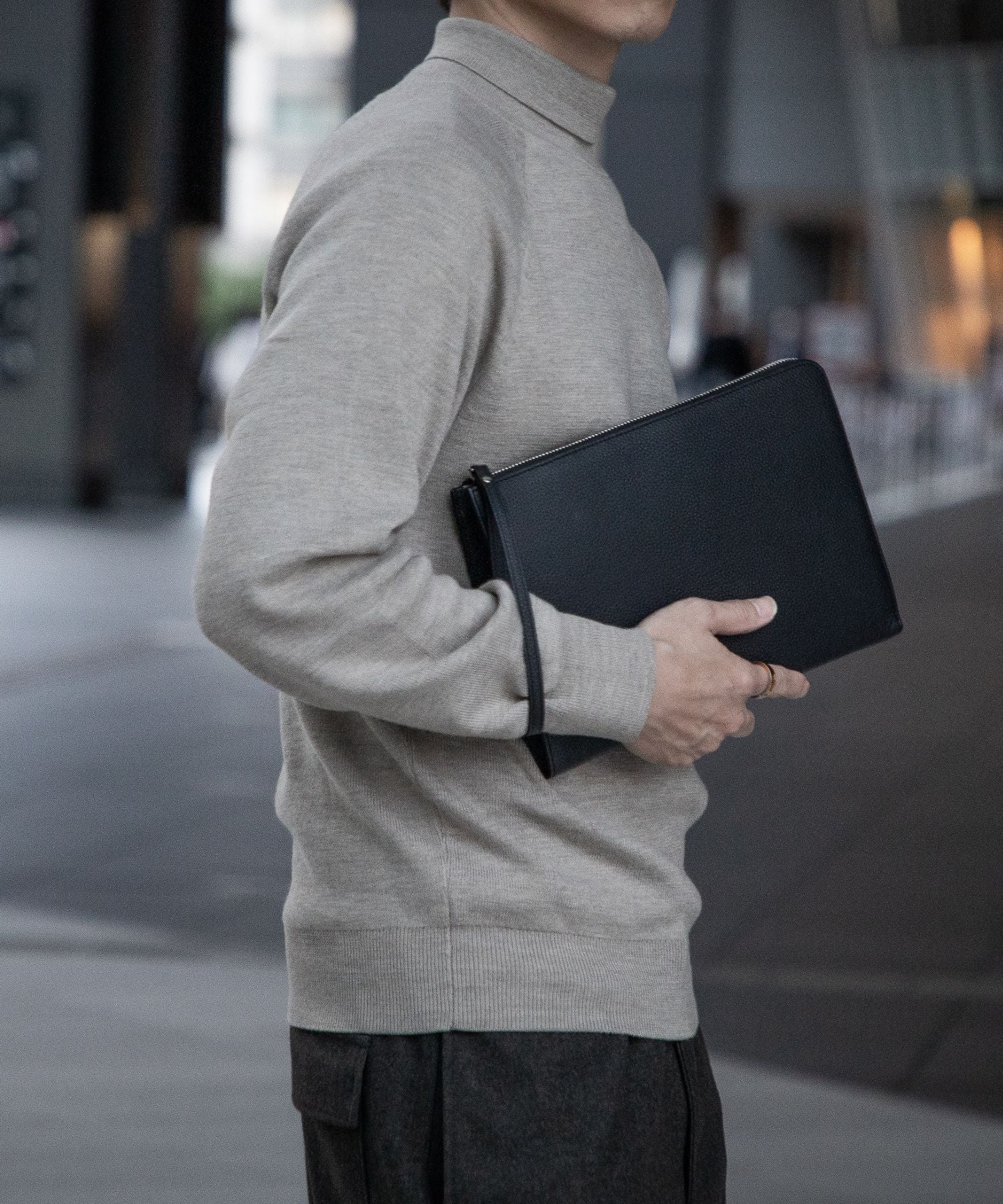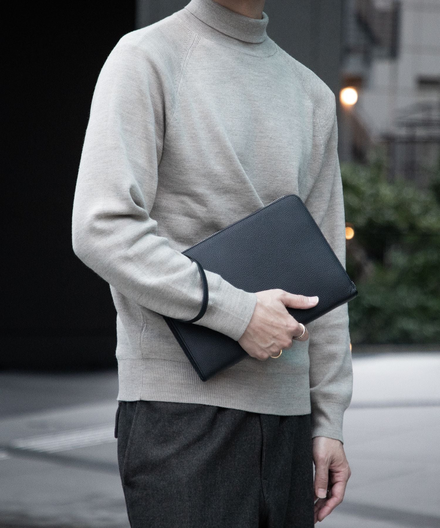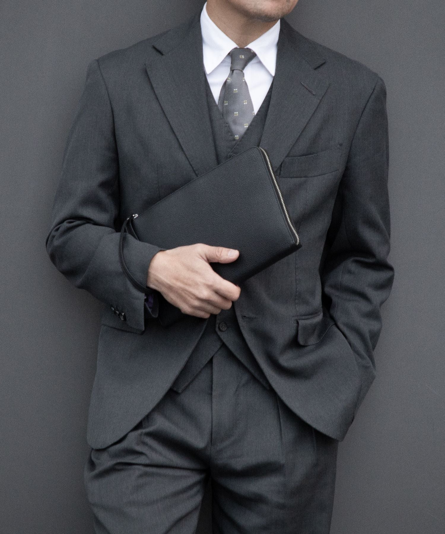 ハレの日の装いを格上げする、上質かつ機能的なクラッチバッグが誕生しました。ミニマルなデザインと、独自開発の撥水レザー「ドライグレイン」が、大切な場面でのあなたの立ち居振る舞いを、スマートに、そしてエレガントに演出します。