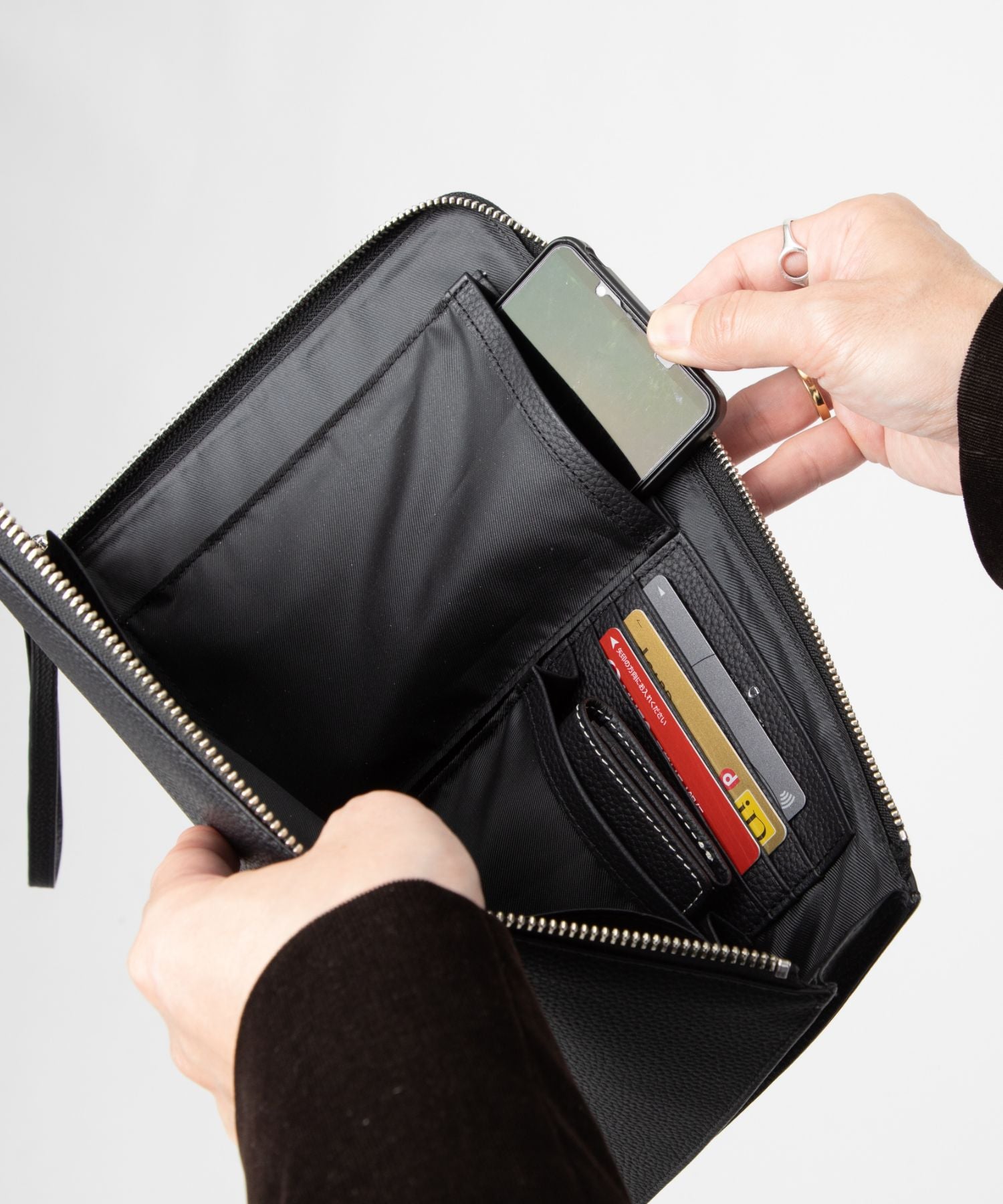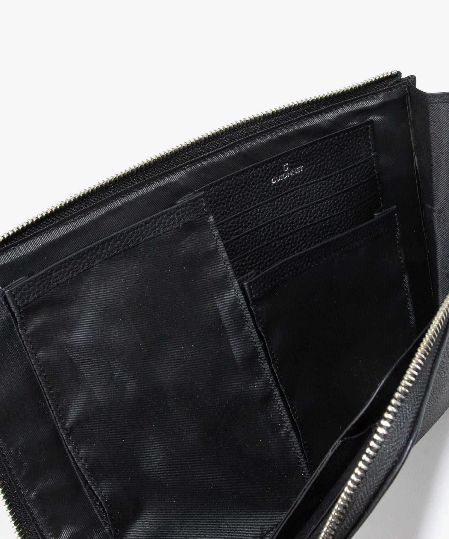 内部には、携帯電話、クレジットカード、そして慶弔袋をそれぞれ独立して収納できるポケットを備えています。必要なものをスムーズに取り出せることで、スマートな立ち居振る舞いをサポートします。