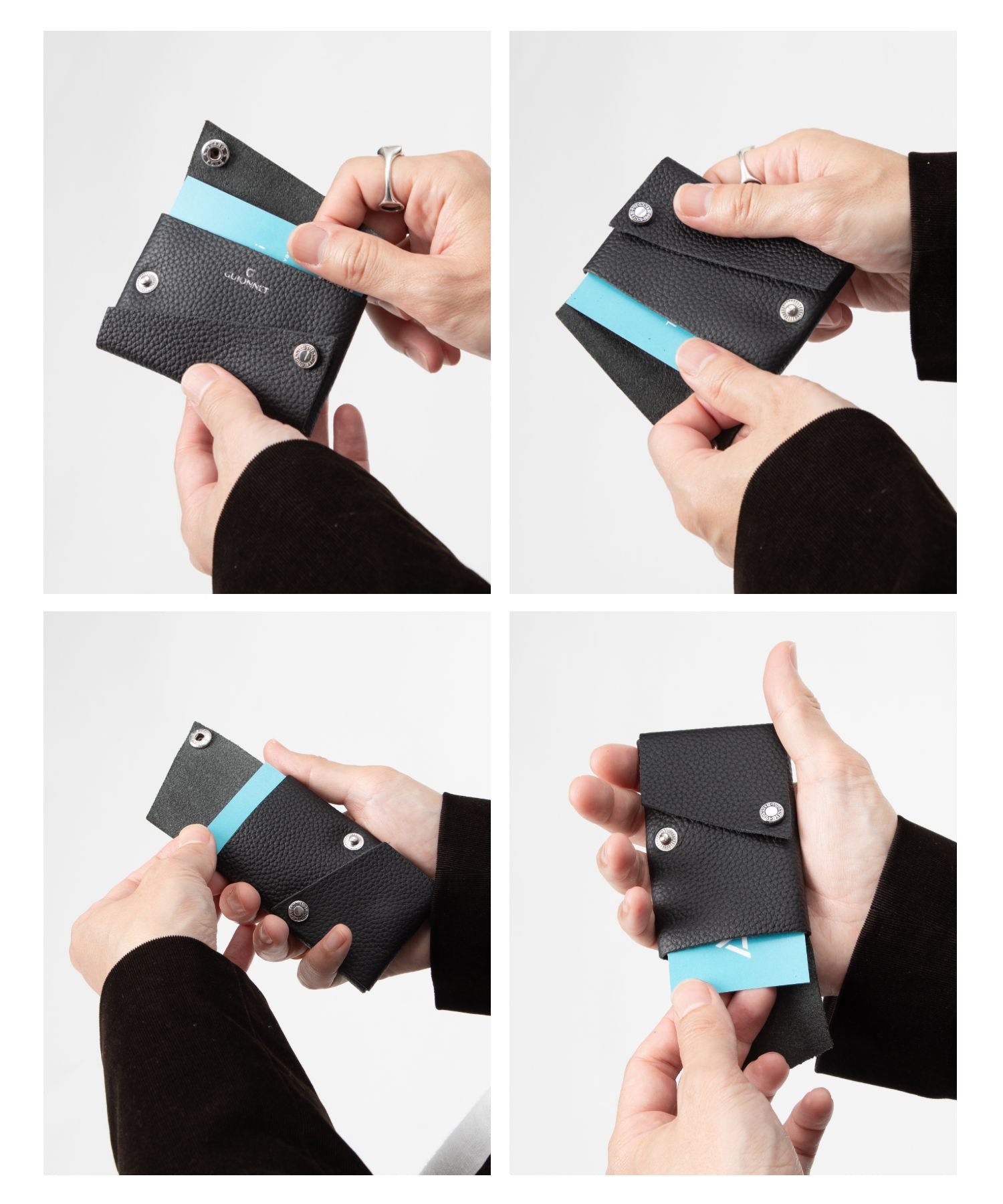 4つのボタンを使い分けることで、必要なカードに素早くアクセス。名刺入れとしてはもちろん、普段使いのクレジットカードやICカードの収納にも最適です。