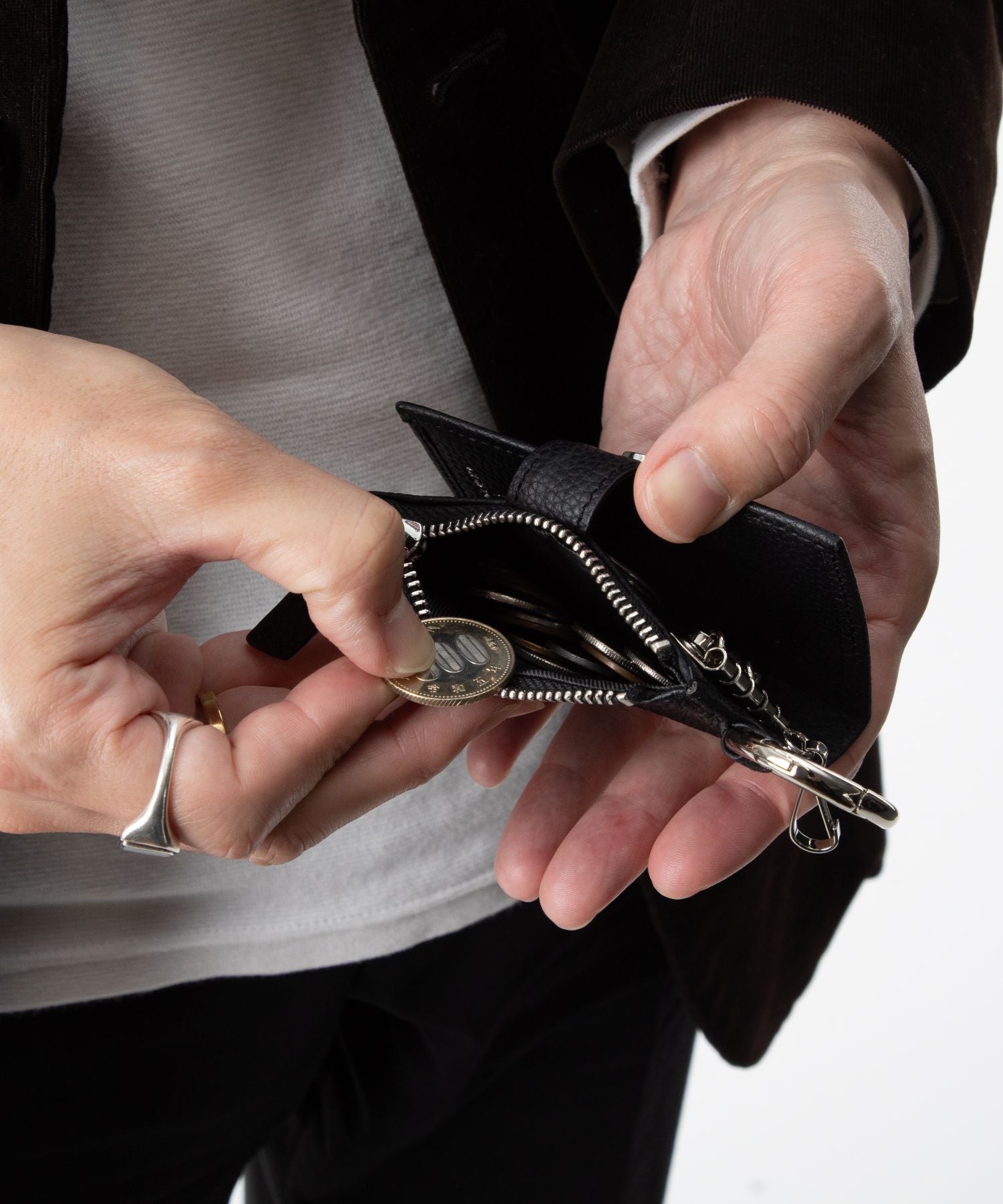 側面には、駐車場の精算時やちょっとした買い物で活躍するミニジップポケットを配置。小銭をスマートに収納・取り出しでき、会計時にもたつかせません。