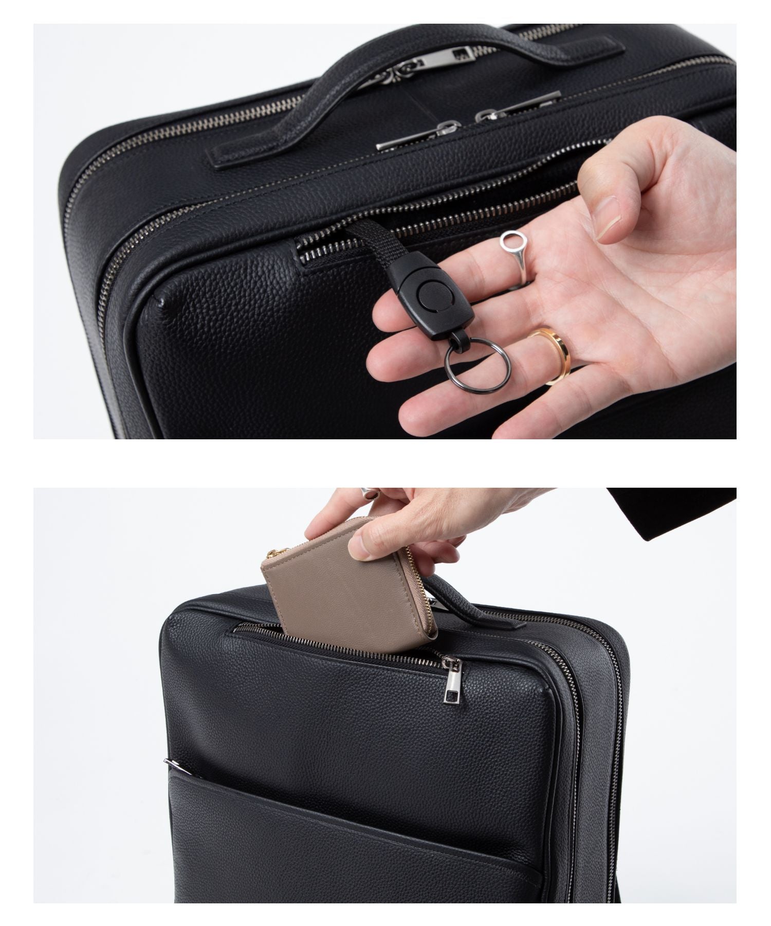 バッグのトップには、携帯電話や鍵など、頻繁に取り出す小物を収納できるミニジップポケットを配置。メイン収納を開けずに、必要なものに素早くアクセスできます。